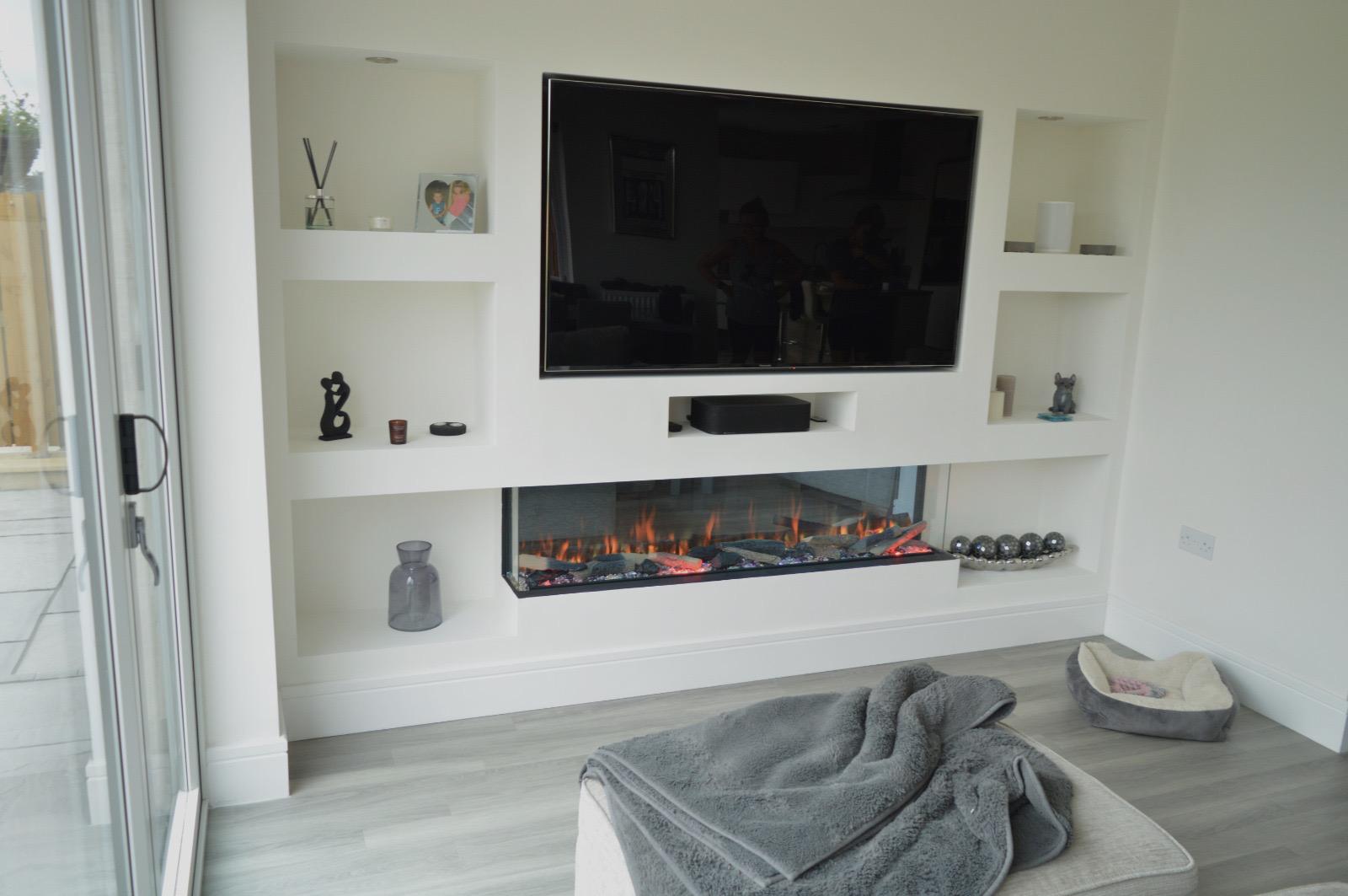 This package includes a professionally built media wall with clean plastered lines, a flush TV mounting area and an integrated electric fireplace, creating a seamless and modern focal point. Every installation is finished to a high standard with concealed wiring and a smooth surface ready for painting.